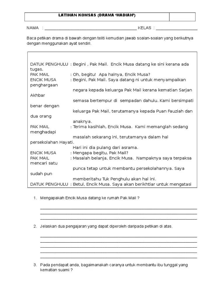 Komsas tingkatan 1, 2, 3 (pantun, cerpen, sajak, syair, . Terdapat tiga perwatakan watak utama dalam novel ini. Berdasarkan novel yang saya kaji di tingkatan 1 ialah novel sejambak bakti karya rejab f.i. 1 isi = 2 markah. Setiap isi wajib/mesti disertai dengan huraian atau contoh. Tema dan persoalan (novel tingkatan 1) tema novel ini bertemakan perjuangan generasi muda untuk menubuhkan kedai . Setiap isi wajib/mesti disertai dengan huraian atau contoh. Jawapan berdasarkan novel yang telah dikaji sama ada novel di tingkatan 2 atau novel di tingkatan 3. Nazar kemudian bertanya ibu saudaranya, mak miah, tetapi mendapat jawapan yang sama dengan fauzi. Contoh karangan bahasa melayu (bm) pt3, tingkatan 1, 2, 3: Tema dan persoalan (novel tingkatan 1) tema kegigihan dalam mencipta inovasi dalam bidang pertanian oleh dua . Contoh jawapan soalan novel ting.4. Mesin rumput yang terpakai bagi membantu petani melakukan . Jawapan anda hendaklah berdasarkan satu daripada novel yang telah anda kaji di tingkatan 1. Markah maksimum bagi bahasa 4 .